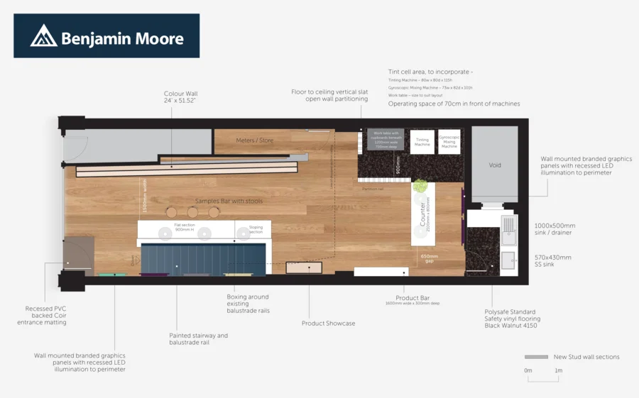 We wanted the space to feel more like a studio as opposed to a shop. A major part of creating that environment was the samples bar we installed down the centre of the showroom. This prompted people to sit down to discuss and share ideas with team members. The main retail display runs along the left hand side of the showroom. Whilst it’s a natural focal point for the store, we were keen to encourage people towards other areas of the store. To do this we used large scale LED back illuminated graphics carefully positioned along the right hand wall, leading people through the space.